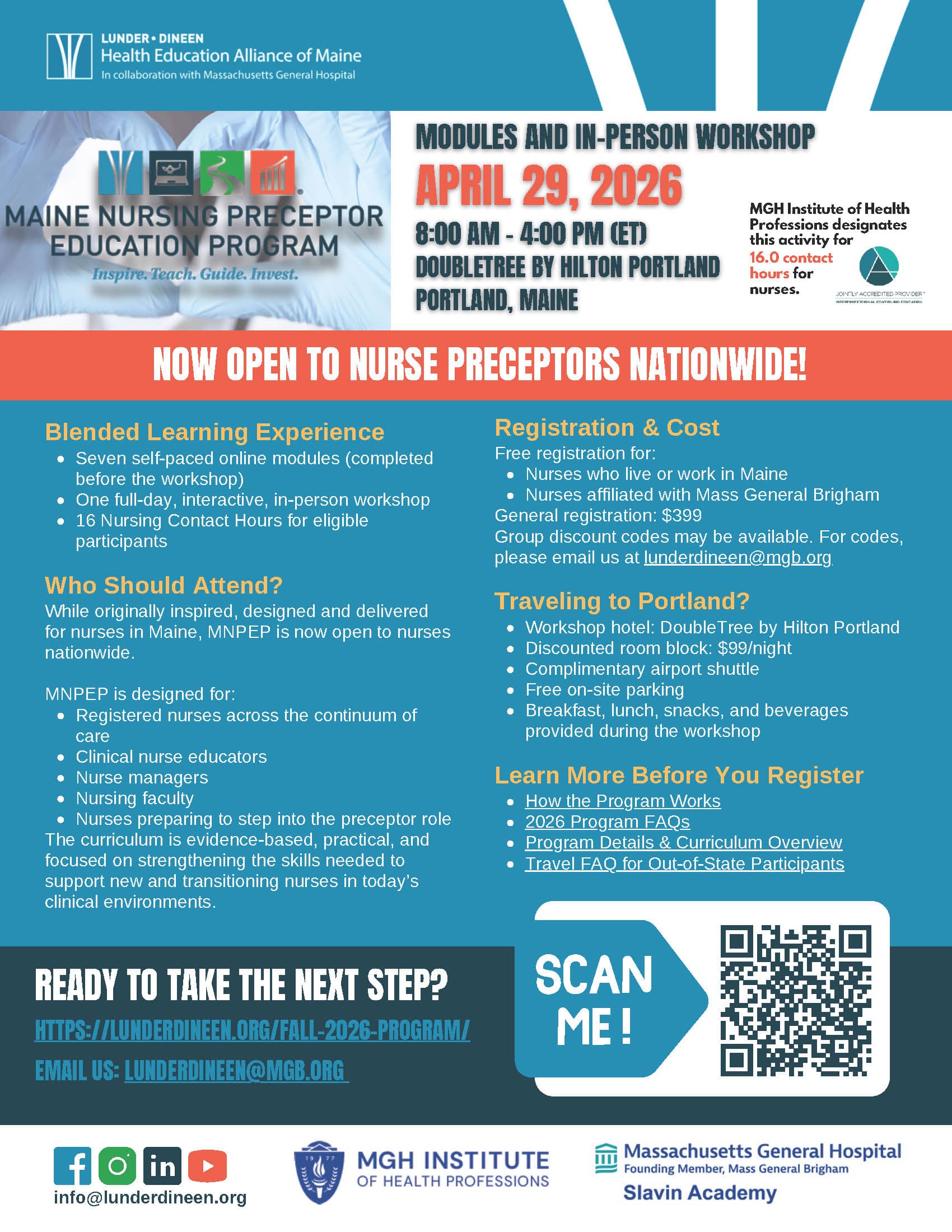 Welcome to the Fall 2025 Maine Nursing Preceptor Education Program (MNPEP), a premier professional development opportunity designed to enhance the skills and knowledge of nurse preceptors nationwide. Founded by the Lunder-Dineen Health Education Alliance of Maine, a program of Massachusetts General Hospital (MGH), MNPEP addresses the critical need for formally trained nurse preceptors across the continuum of care.