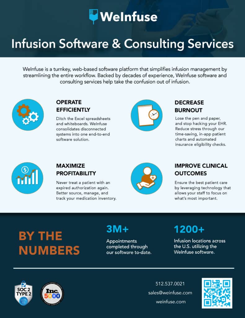 WeInfuse is a turnkey web-based software solution that simplifies infusion management by streamlining the entire workflow and taking the confusion out of infusion. Our software provides features such as: