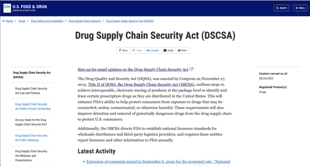 In summary, the DQSA was an act of Congress that created the DSCSA and many other new regulations. The act laid out a multi-year implementation plan with various milestones along its timeline. We are now coming up on one of the last deadlines of DSCSA, which is full system interoperability for unit-level tracing by November 2023. You can read all about it on the FDA’s webpage and we will link to additional resources as we go.